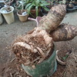 親株の根裁きをやり、土を落とし根を切り揃えて鉢へ植える準備する。